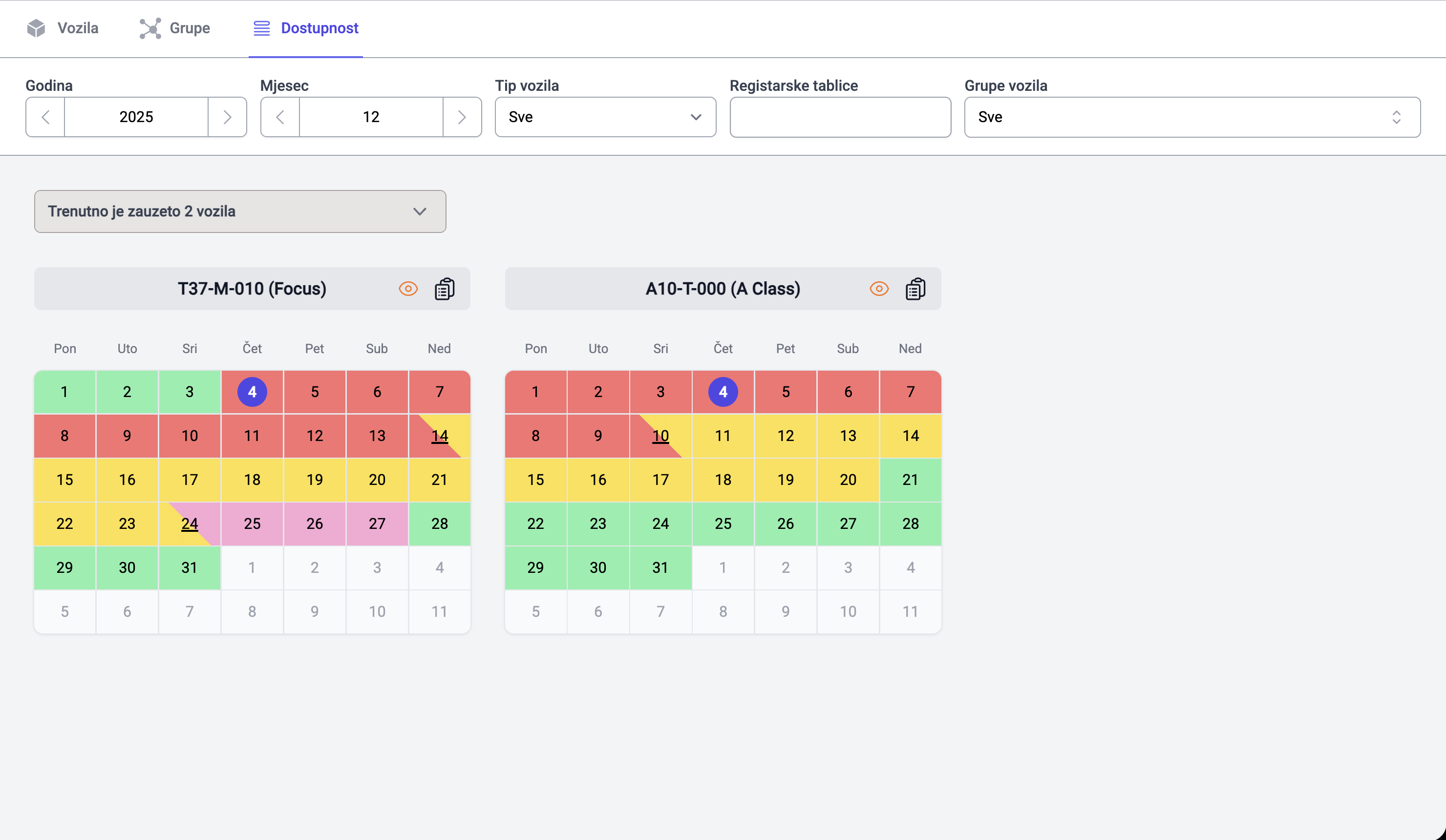 Kalendarski pregled svih vozila na mjesečnom nivou, s jasnim objašnjenjima stanja i filterima za brzo pronalaženje.